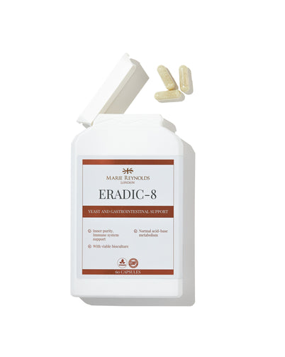 An all-in-one Candida yeast balance, digestion, colon health and detox support supplement. It contains 15 powerful ingredients, including active herbals, probiotics and other natural cleansing and protective agents, which have anti-bacterial, anti-fungal, anti-microbial and anti-inflammatory actions. This supplement helps to support the correct balance of gut micro-flora (bacteria and yeasts), integrity of the gastrointestinal tract and encourages the growth of friendly bacteria (probiotics), which of course reflects in the skin and reduces excessive inflammation and mucus. Ideal for use in conjunction with a low yeast and low sugar diet.