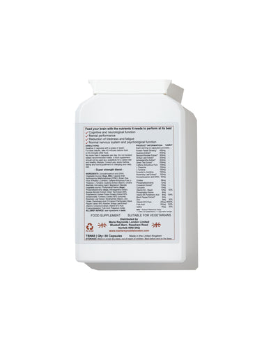 Ingredients: Docosahexaenoic acid (DHA) (Vegetable Source) (Soya, Milk); Capsule Shell: Hydroxypropyl Methylcellulose (HPMC); Brown Rice Flour; N-Acetyl L-Carnitine; Caffeine Anhydrous Pure; L-Theanine; L-Tyrosine; Guarana Extract (Starch); Choline Bitartrate; Anti-caking Agent: Magnesium Stearate (vegetable source); Phosphatidyl Serine (Soya); Phosphatidylcholine (Soya); Ashwagandha Extract; Bacopa Monnieri Extract; Green Tea Extract (95% Polyphenols); Korean Panax Ginseng Extract 80% Ginsenocides; Turmeric Extract 95% curcumin; Rosemary Leaf Extract; Nicotinamide (Niacin); Zinc Citrate; Pantothenic Acid (D-Calcium Panthonate); Black Pepper Extract 95% Piperine; Ginkgo Leaf Extract (Starch); Cinnamon Extract; Vitamin B12 Pure (Cyanocobalamin); Folic Acid; Potassium Iodide.