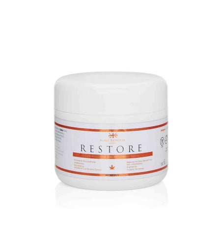 Mix one teaspoon of Restore with a small amount of water and blend to a smooth paste. Apply evenly to the face and neck and leave for 5 -10 minutes. Before removing, loosen the mask with wet hands and massage for a further minute paying particular attention to areas of concern. Remove the residue with warm water or a face cloth and follow with MRL Epidermal Blanket or desired moisturiser. Use twice weekly.